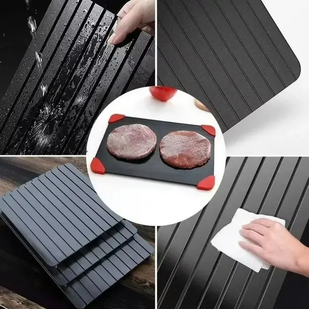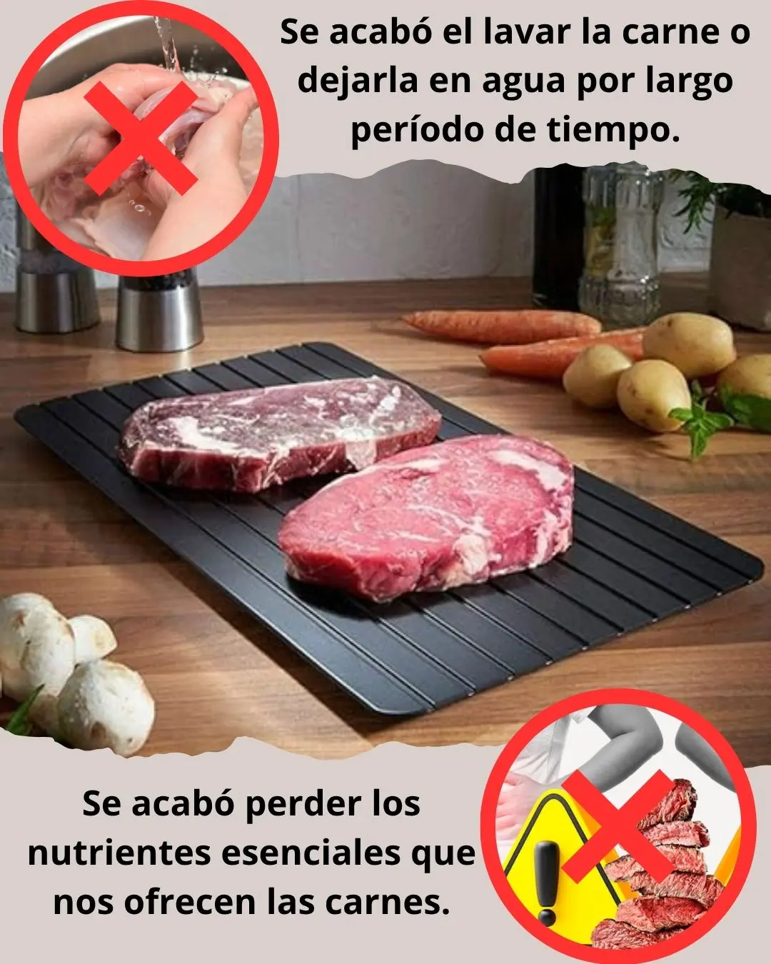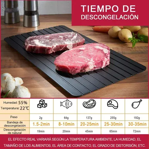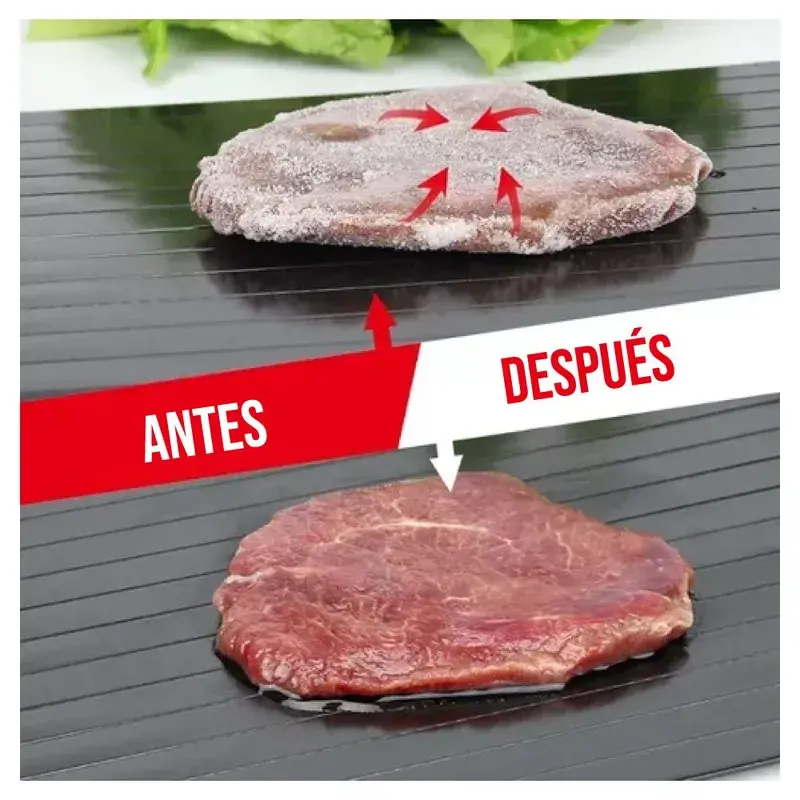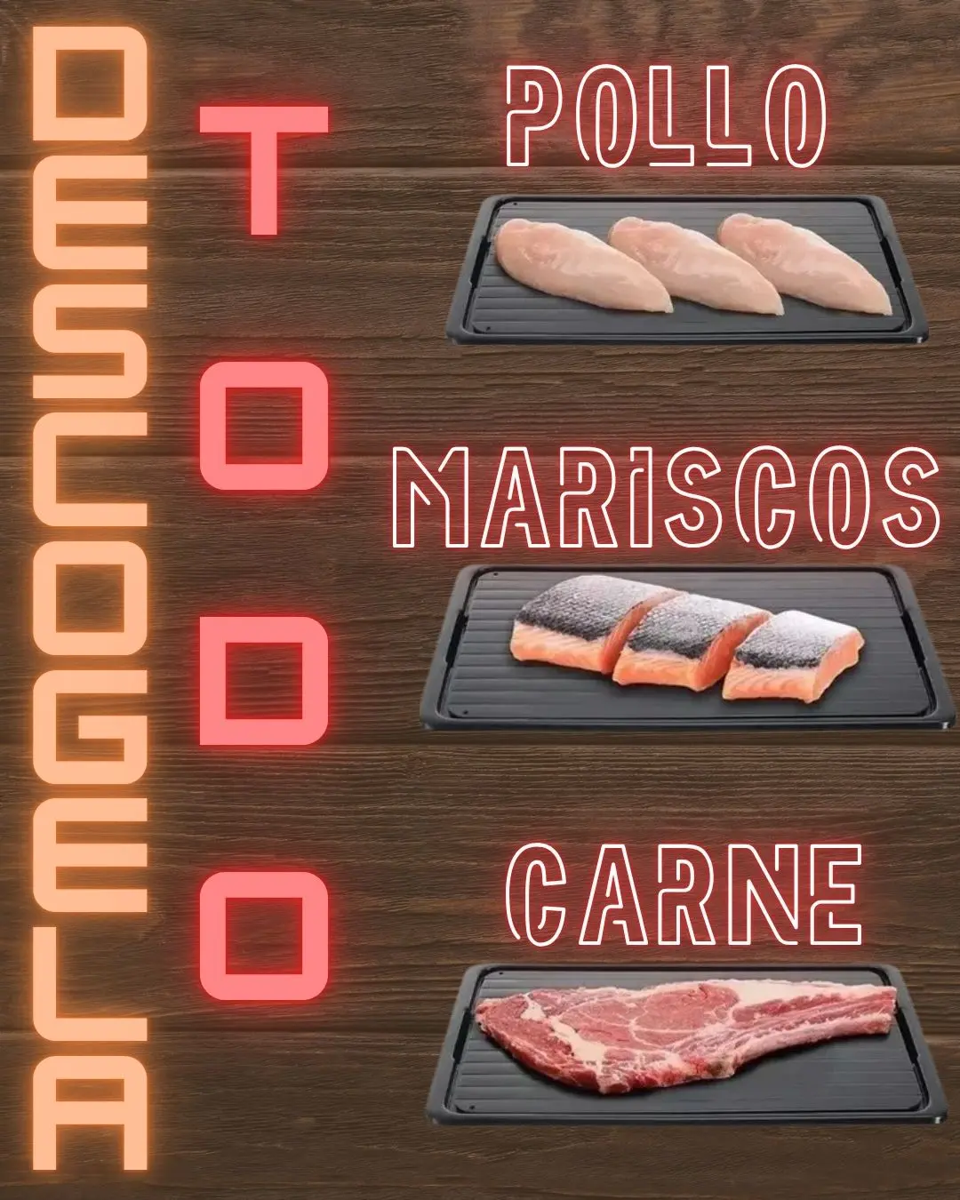 Con la Bandeja Descongeladora Rápida, eso quedó en el pasado. Solo colocas la carne congelada encima… y en minutos está lista para cocinar, SIN electricidad, SIN químicos y SIN perder jugosidad.