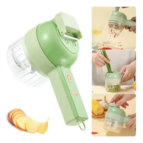 Con la Picadora Eléctrica Multifuncional 4 en 1, tendrás un aliado que hace todo por ti: pica, rebana, limpia y mezcla con solo presionar un botón.